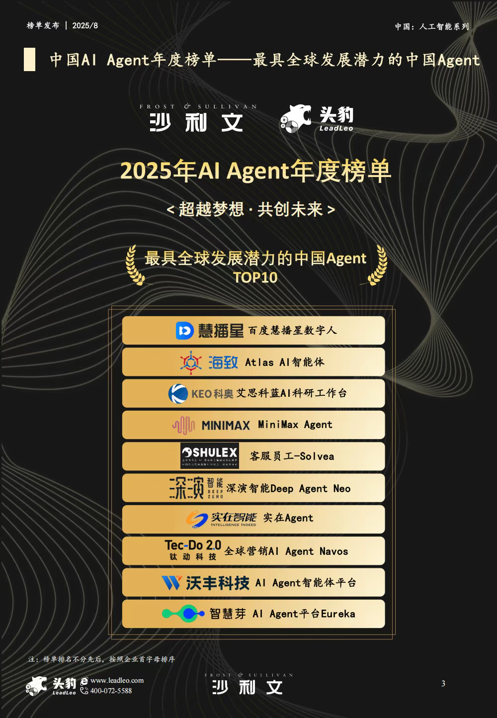 8月28日,全球知名咨询机构沙利文联合头豹研究院发布了《2025年中国AI Agent(智能体)最佳实践应用榜单》,凭借自主研发的 AI 智能体平台 Deep Agent Neo 的突出实力,凤凰联盟智能从 150 家参评企业、近 300 个产品 / 解决方案中脱颖而出,成功入选 “最具全球发展潜力的中国 Agent” TOP10 榜单,再度印证其在 AI Agent 领域的技术硬实力与全球化发展潜力。